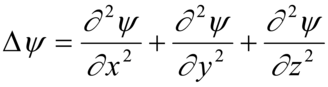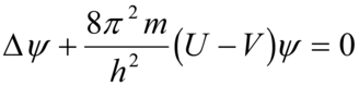 è il laplaciano di ψ (x, y, z); U, V e m sono rispettivamente l'energia totale, l'energia potenziale e la massa dell'elettrone; h è la costante di Planck. Dal punto di vista fisico, il quadrato del modulo di ψ, |ψ|², indica la probabilità che ha l'elettrone di essere presente nel punto di coordinate x, y, z dello spazio. Questa descrizione probabilistica di modello atomico non consente di rappresentare l'atomo secondo un preciso schema spaziale: esso può solo essere raffigurato da un nucleo circondato da una nube elettronica di densità di carica (carica nell'unità di volume) ρ(x, y, z)=ρ|ψ|². La soluzione dell'equazione di Schrödinger dipende da tre parametri che assumono solo valori interi: n, numero quantico principale; l, numero quantico azimutale (l=0, 1, 2, ..., n-1); m, numero quantico magnetico (|m|≤l)