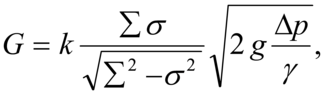 dove Σ e δ sono le aree della sezione massima e della sezione minima del tubo di Venturi, Δp la differenza tra le pressioni in tali sezioni che può essere misurata con un manometro differenziale, γ il peso specifico del fluido, g l'accelerazione di gravità e k un coefficiente di efflusso. I venturimetri sono strumenti normalizzati che consentono un'ottima precisione di misura con errori inferiori all'1%; sono usati soprattutto per condotte in pressione; per altre misurazioni si preferiscono boccagli e diaframmi meno ingombranti. Tubi di Venturi sono utilizzati inoltre negli eiettori di vapore, nei carburatori per motori a scoppio e anche negli impianti di depurazione a umido (filtri Venturi): in quest'ultimo caso i gas contenenti polveri vengono fatti passare in una gola giungendo a velocità comprese tra 60 e 200 m/s; alla gola è collegato un tubo con un'estremità immersa in acqua, la quale viene risucchiata per la depressione che regna nella gola e viene polverizzata. Le goccioline conglobano le particelle polverose trascinate dall'aria; nel tratto divergente l'aria rallenta più rapidamente delle goccioline, che hanno maggior inerzia e vengono abbattute in un ciclone; con questi filtri è possibile raggiungere efficienze prossime al 100%.