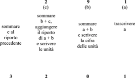 Mentre nel calcolo letterale hanno interesse solo formule e procedimenti che dipendono dalle regole formali di calcolo, oggetto del calcolo numerico sono i procedimenti tecnici da seguire per risolvere i problemi in esame, cioè per ottenere uno o più risultati numerici come soluzione di problemi già impostati in precedenza con i metodi del calcolo letterale e per i quali si sa che esistono soluzioni. Rientrano in questo capitolo della matematica l'esecuzione delle operazioni elementari, il calcolo delle radici di un numero, il calcolo del valore di un'espressione numerica, il calcolo delle soluzioni di un'equazione o di un sistema di equazioni di qualunque tipo, il calcolo dei valori di una funzione in corrispondenza a determinati valori della variabile indipendente. Possono essere considerati inoltre sezioni del calcolo numerico il calcolo rapido e il calcolo approssimato. § Il calcolo rapido comprende numerosi procedimenti che permettono di eseguire rapidamente determinati calcoli. Per esempio, per moltiplicare per 10, 100, 1000, ecc. un numero intero si aggiungono a esso uno, due, tre, ecc. zeri, oppure, se è decimale, si sposta verso destra la virgola di uno, due, tre, ecc. posti e si fa l'inverso nelle divisioni. Da questa regola ne discendono immediatamente altre come quelle per moltiplicare o dividere un numero per 5 o per 25 o per 9, basate sulla considerazione che 5=10:2, che 25=100:4 e che 9=10–1. Per il calcolo rapido di prodotti esistono anche altre interessanti regole: per esempio, per moltiplicare un qualsiasi numero per 11 si segue, procedendo da destra verso sinistra, lo schema qui illustrato per il numero 291 (291×11=3201).