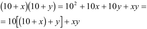 Anche per moltiplicare due numeri compresi tra 10 e 20 esiste la possibilità di abbreviare il calcolo. Sia da calcolare 18∤19: si somma 18+9=27, si moltiplica il risultato per 10, 27∤10=270, si moltiplica 9∤8=72 e infine si sommano i risultati dei due prodotti: 270+72=342. I vari passaggi possono essere spiegati ricorrendo all'algebra. Infatti, sia 10+x il primo numero e 10+y il secondo numero; il loro prodotto può essere scritto