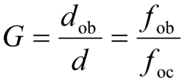in cui αa è il campo apparente, cioè il campo che l'oculare permette di vedere, e αr è il campo reale, cioè l'angolo sotto il quale si osserva, attraverso l'obiettivo, il campo apparente. Si trova che questo rapporto è uguale al rapporto tra il diametro dell'obiettivo, dob, e il diametro della pupilla di uscita, d, o, equivalentemente, al rapporto tra la distanza focale dell'obiettivo, fob, e quella dell'oculare, foc; si ha pertanto: