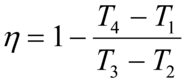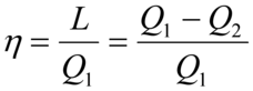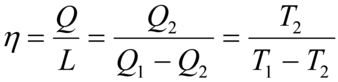 dove Q₁ è il calore sottratto alla sorgente (termostato) alla temperatura T₁, Q₂ è il calore restituito al corpo (termostato) alla temperatura T₂ e non utilizzato. Tra i cicli termodinamici sono particolarmente importanti il ciclo di Carnot, il ciclo frigorifero, il ciclo Rankine, il ciclo Otto, il ciclo Diesel, il ciclo Stirling, il ciclo Brayton. È importante tener presente che questi sono cicli puramente teorici, cioè ideali, e quindi non coincidono esattamente con quelli realizzati nei corrispondenti motori. § Ciclo di Carnot,il fluido termodinamico che compie tale ciclo è costituito da una sola sostanza omogenea: un gas perfetto. Il ciclo di Carnot è pertanto un ciclo ideale che non può essere realizzato materialmente. Esso è composto da 4 trasformazioni reversibili: due isoterme (che avvengono, cioè, a temperatura costante) e due adiabatiche (che avvengono, cioè, senza scambio di calore con l'ambiente esterno). Il fluido riceve il calore Q₁ lungo l'isoterma di espansione T₁ e cede il calore Q₂ lungo l'isoterma di compressione T₂. Le quantità di calore Q₁ e Q₂ coincidono con i lavori scambiati lungo le due isoterme. Nel ciclo viene assorbito il calore Q₁ e ceduto il calore Q₂; il ciclo riceve quindi complessivamente il calore Q=Q₁–Q₂=L (lavoro del ciclo). Pertanto il rendimento η è dato dall'espressione: