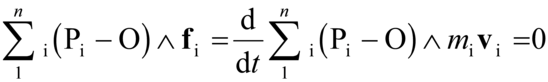 La grandezza rappresentata dalla sommatoria è la quantità di moto, Q, del sistema e pertanto: Q=costante. Poiché, poi, la quantità di moto di un sistema coincide con quella del centro di massa, ovvero del baricentro, nel quale si immagini concentrata la massa totale, da questo teorema deriva che il moto del baricentro si conserva e non può essere modificato da forze interne. D) Conservazione del momento della quantità di moto. Deriva dai teoremi precedenti e dalla considerazione che il momento delle forze interne è nullo: