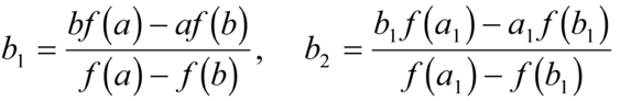Si può dimostrare che b₁ rappresenta un valore approssimato per eccesso o per difetto della soluzione, secondo che a₁ lo è per difetto o per eccesso e che sia a₁, a₂, ..., a, ..., sia b₁, b₂, ..., b, ... tendano al valore della radice. Per esempio, sia data l'equazione: f(x)≡-x3–2x+5=0, che ha una soluzione compresa fra 2 e 2,1. Ponendo a=2,1 e b=2 si trova: a₁=2,0946, b₁=2,0942, a₂=2,094552, b₂=2,094551, e già con questi valori si hanno sicuramente 5 decimali esatti; proseguendo si trova un valore approssimato con la precisione che si vuole.