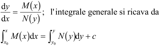 ottenendo così in tutto n-integrali linearmente indipendenti dell'equazione omogenea; ogni integrale dell'omogenea è dato da combinazioni lineari di questi; l'integrale generale dell'equazione completa è la somma di un integrale particolare della stessa con l'integrale generale dell'omogenea. B) Equazione differenziale del primo ordine a variabili separabili è del tipo