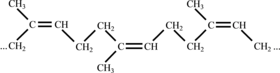 In effetti, riscaldando la gomma a temperature tanto elevate da provocarne la completa decomposizione si libera, accanto a numerosi altri prodotti, dell'isoprene; viceversa, trattando l'isoprene per esempio con piccole quantità di perossidi, esso polimerizza formando una massa di proprietà simili anche se non identiche a quelle della gomma. Nelle lunghissime catene di atomi di carbonio che costituiscono lo scheletro delle macromolecole del caucciù, le singole unità di isoprene sono concatenate tra loro per i due estremi più lontani; nella polimerizzazione il sistema di due doppi legami coniugati delle singole molecole di isoprene si trasforma in un unico doppio legame centrale, lasciando libere ai due estremi due valenze che legano altre unità di isoprene: il doppio legame centrale che così si forma in ogni unità presenta la configurazione cis, come risulta dalla formula seguente che mostra un tratto della catena costituito da tre unità di isoprene: