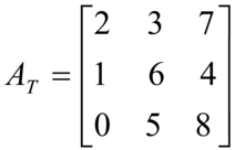 In una matrice quadrata A=[a] di ordine n gli elementi a11, a22,..., a si dicono elementi della diagonale principale di A, mentre si dicono elementi della diagonale secondaria gli elementi a1n, a2-1,..., a1. Nella matrice quadrata di ordine 3 data sopra, i numeri 2, 6 e 8 formano la diagonale principale mentre i numeri 0, 6 e 7 formano la diagonale secondaria. Una matrice quadrata A=[a] si dice triangolare superiore se tutti gli elementi che si trovano sotto la diagonale principale sono uguali a 0, cioè se, per ogni i≥j, si ha a=0. Una matrice quadrata si dice simmetrica se gli elementi simmetrici rispetto alla diagonale principale sono uguali, cioè se si ha a=a per ogni i e j. La matrice di ordine 3 data sopra non è simmetrica perché si ha, per esempio, a12=1≠3=a21. Una matrice si dice antisimmetrica o emisimmetrica se si ha a=-a. Gli elementi della diagonale principale di una matrice antisimmetrica sono tutti nulli. La trasposta di una matrice A di tipo (m, n) è la matrice A di tipo (n, m) che si ottiene da A scambiandone le righe con le colonne. Per esempio la trasposta della matrice di ordine 3 vista sopra è: