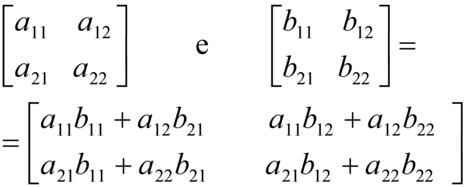 , ottenuto moltiplicando gli elementi della riga i-esima di A, cioè a1, a2,..., a, rispettivamente per gli elementi della colonna j-esima di B cioè b1, b2,..., b ed eseguendo poi la somma dei prodotti ottenuti. Per esempio, nel caso di due matrici quadrate di tipo (2, 2):