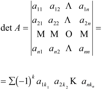 A ogni matrice quadrata A si associa un numero detto determinante di A. Si indica con il simbolo det A, oppure si scrive tutta la matrice A e si sostituiscono le parentesi tonde (o quadre) con barre verticali. Si definisce il determinante di una matrice quadrata A=[a] di ordine n nel seguente modo: