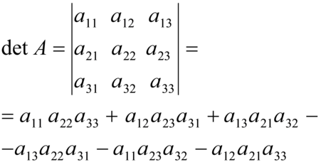 formula appena data può essere facilmente ricordata utilizzando la seguente regola di Sarrus, consistente nel riscrivere le prime due colonne della matrice e nel considerare la somma dei prodotti degli elementi delle tre diagonali parallele alla diagonale principale e sottraendo a essa la somma dei prodotti degli elementi delle tre diagonali parallele alla diagonale secondaria: