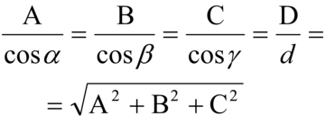 La forma normale dell'equazione del piano è xcos α+ycos β+zcos γ-d=0. La distanza h di un punto P0(x0, y0, z0) dal piano è data dall'espressione h=x0 cos α+y0 cos β+z0 cos γ-d. La condizione di ortogonalità di due piani è data dalla relazione