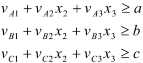 La programmazione lineare è una tecnica matematica particolarmente adatta per risolvere problemi di massimizzazione o minimizzazione di una funzione lineare di variabili come costi, profitti, ecc. unitari che possono presentare una serie di vincoli, a loro volta espressi come funzioni lineari delle variabili considerate. Si supponga di voler ottenere un mangime per polli che costi il meno possibile, ma contenga determinate quantità minime di certe vitamine. Supponiamo, per fissare le idee, che il mangime sia composto da tre ingredienti e di volere che in esso siano presenti le vitamine A, B e C nelle quantità minime a, b e c rispettivamente. Di ogni ingrediente conosciamo il costo per grammo (siano c1, c2 e c3 i rispettivi costi) e il contenuto di ogni vitamina in un grammo (siano v1A, v1B e v1C i contenuti delle vitamine A, B e C nel primo ingrediente e analogamente per gli altri due ingredienti). Indicando con x1, x2 e x3 le quantità di ognuno dei tre ingredienti espresse in grammi, le limitazioni sulle quantità minime per ognuna delle tre vitamine si esprimono nelle seguenti condizioni: