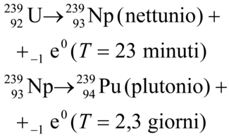 Se Z=93 ed esiste anche la possibilità di una successiva ulteriore emissione di un elettrone con formazione di un nuclide con Z=94. Questi elementi, che avrebbero dovuto avere Z>92, furono chiamati transuranici perché il loro posto nella tavola periodica degli elementi sarebbe stato oltre quello dell'uranio. Fra il 1934 e il 1939 furono fatti molti esperimenti per creare elementi transuranici ma questi, anche se furono probabilmente realizzati, non furono individuati; venne realizzata, invece, la fissione nucleare. Nel 1940 fu provato che bombardando l'uranio con neutroni lenti si produceva un nuovo isotopo 239U emettitore di elettroni con periodo di dimezzamento di 23 minuti e che decade in un isotopo di un nuovo elemento (detto poi nettunio) con Z=93 che, a sua volta, per emissione di un elettrone decade con un periodo di dimezzamento di 2,3 giorni in un nuovo elemento con Z=94; le reazioni sono: