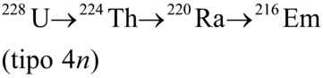 anni. Differente è il caso quando il padre vive più a lungo del figlio (λ₁<λ₂), ma il suo periodo di dimezzamento non è molto lungo (equilibrio transiente) poiché in questo caso si deve considerare λ₁≠0. Infine, quando il padre ha un periodo di dimezzamento più corto del figlio (λ₁>λ₂) non si raggiungono condizioni di equilibrio. Tutti i nuclidi radioattivi naturali appartengono a una delle tre serie radioattive denominate dell'uranio, dell'attinio e del torio dal nome dell'elemento primo della catena. Nella serie dell'uranio il numero di massa di ogni membro può essere espresso nella forma 4n+2 (con n intero), nelle serie dell'attinio e del torio il numero di massa è dato rispettivamente dall'espressione 4n+3 e 4n. Dalle tabelle delle tre serie si può notare che l'emissione di una particella α diminuisce di 2 unità la carica di un nucleo e di 4 unità il suo numero di massa mentre l'emissione di una particella β aumenta di una unità il numero di carica del nucleo mentre lascia invariato il suo numero di massa.