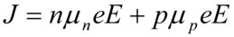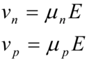 dove vn e vp sono rispettivamente le velocità medie di trascinamento degli elettroni e delle lacune, E il campo elettrico, μ e μ rispettivamente le mobilità degli elettroni e delle lacune. La mobilità di un portatore di carica dipende dalla temperatura, dalla presenza di imperfezioni reticolari e dal tipo di materiale; è invece indipendente dall'intensità del campo elettrico fino a che questo non assume valori così alti da incrementare in modo non trascurabile la velocità che il portatore possiede per effetto della sola agitazione termica (velocità termica). Infatti in queste condizioni i portatori di carica possono diventare più caldi del reticolo in cui si muovono, nel senso che possono avere velocità termiche che, in condizioni di equilibrio, corrisponderebbero a temperature superiori; poiché i portatori caldi rispetto al reticolo in cui si muovono devono cedere a quest'ultimo parte dell'energia acquistata per effetto del campo elettrico, si osserva una diminuzione della mobilità al di sopra di un certo valore del campo elettrico. Per quanto si è detto precedentemente, la corrente elettrica in un semiconduttore è data dalla risultante di un flusso di cariche negative (gli elettroni liberi) e di un flusso simultaneo in senso opposto di cariche positive (le lacune). La densità di corrente può essere pertanto espressa dalla relazione