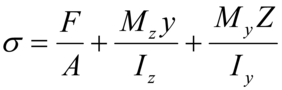 Quando la risultante del sistema delle forze applicate presenta un'eccentricità rispetto al baricentro della sezione, considerando sempre una trave, questa si trova soggetta a due sollecitazioni: uno sforzo normale assiale e un momento flettente; queste due azioni insieme determinano, oltre alla contrazione delle fibre, anche una rotazione della sezione. Lo spostamento complessivo risulta quindi essere una rotazione intorno a un asse non baricentrico, la cui posizione varia col variare del punto di applicazione della forza (centro di pressione) secondo l'antipolarità stabilita dall'ellisse centrale di inerzia; il calcolo delle tensioni viene fornito dalla somma algebrica delle δ prodotte dalle due sollecitazioni: