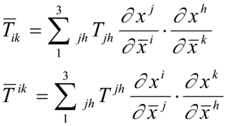 ed entrambe si riducono alla seconda definizione nel caso particolare di coordinate cartesiane ortogonali. Si possono considerare anche componenti miste con un indice di covarianza e uno di controvarianza; la formula di trasformazione è: