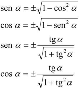 Esse corrispondono rispettivamente alle formule di riduzione al primo ottante e al primo quadrante. Vi sono poi alcune formule, di grande utilità pratica, quali quelle di addizione e sottrazione, di prostaferesi, di duplicazione, di bisezione, di Briggs, formule parametriche. Dalla relazione fondamentale si ricava che i valori che possono assumere le funzioni seno e coseno sono compresi tra -1 e 1, e queste funzioni sono definite per ogni valore dell'angolo variabile, variabilità che può limitarsi, data la periodicità, per esempio, all'intervallo [0, 2π] oppure [-π, π]. Invece le funzioni tangente e cotangente sono definite per tutti i valori dell'angolo α, tranne quelli per cui si ha rispettivamente cos α=0 e sen α=0. Opportune formule, dette di riduzione al primo quadrante, permettono di calcolare i valori delle funzioni trigonometriche usando solo angoli di ampiezza compresa tra 0 e π/2. Formule, dette di riduzione al primo ottante, permettono di calcolare in maniera analoga i valori delle funzioni trigonometriche usando solo angoli di ampiezza compresa tra 0 e π/4.