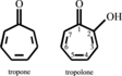 . Sebbene vari composti naturali che presentano un anello tropolonico, come l'alcaloide colchicina e alcuni prodotti del metabolismo di muffe del genere Penicillum, fossero noti da tempo, la loro struttura tropolonica venne proposta da M. J. S. Dewar solo nel 1945. Da allora sono stati isolati altri composti naturali contenenti l'anello tropolonico e la loro preparazione e il loro comportamento chimico sono tuttora oggetto di approfondite ricerche.