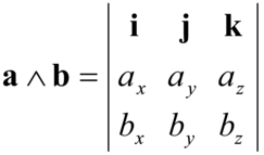 Si dice prodotto vettoriale di un vettore a per un vettore b e si indica a∧b (leggasi a vettore b) il vettore che ha modulo eguale al modulo di a per il modulo di b per il seno dell'angolo convesso compreso fra i due vettori, direzione della perpendicolare al piano individuato dai due vettori, verso indicato dal medio della mano destra, quando con il pollice si indica il verso di a e con l'indice il verso di b. Se φ è l'angolo compreso tra i due vettori si ha |a∧b|=ab sen φ; il modulo del prodotto vettoriale rappresenta l'area del parallelogramma individuato dai due vettori. Il prodotto vettoriale di due vettori paralleli è nullo. Il prodotto vettoriale non gode della proprietà commutativa, poiché mutando l'ordine dei due fattori il prodotto vettoriale muta verso. Il prodotto vettoriale può esprimersi mediante il seguente determinante che ne dà l'espressione cartesiana: