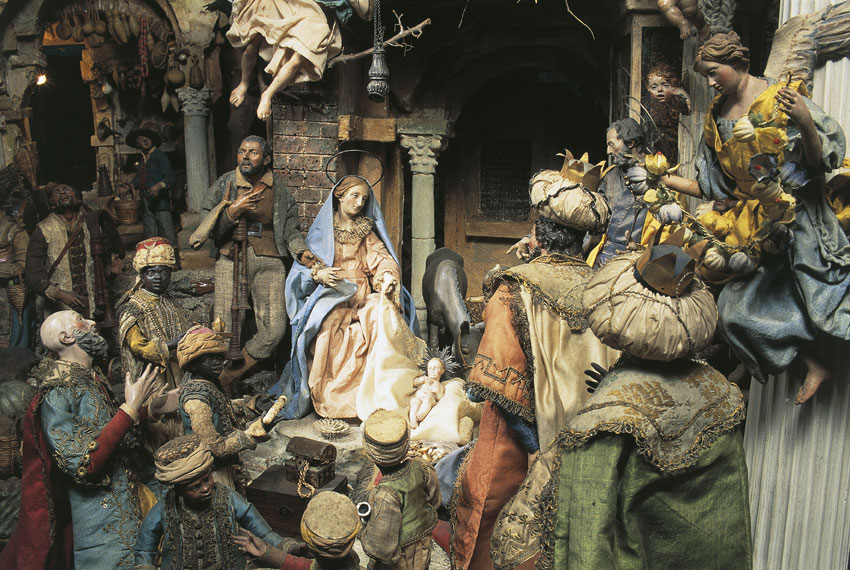 Presepe napoletano con la riproduzione di San Gregorio Armeno a Napoli con l'Arco di San Lorenzo Maggiore Per realizzare i presepi napoletani agli artisti più noti (Celebrano, Somma, Sanmartino, Vaccaro a Napoli; Maragliano, Pittaluga a Genova; Matera in Sicilia) si affiancò una schiera di artigiani per l'esecuzione delle figure, per lo più intagliate in legno con teste, mani e piedi in terracotta, e della ricchissima suppellettile (vestiti, gioielli, arredi, finimenti ecc.).