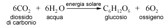 La reazione complessiva della fotosintesi è schematizzabile nella formazione di 1 molecola di glucosio (con legami ricchi di energia) e di 6 molecole di ossigeno a partire da 6 molecole di diossido di carbonio e 6 molecole di acqua: