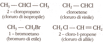 Gli alogenuri alchilici contengono uno o più atomi di alogeno in una catena alifatica (R) e hanno formula generale RX (dove X = Cl; Br, I). Esempi: