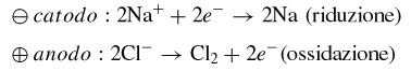 Sotto l'azione del campo elettrico generato dagli elettrodi, gli ioni con carica positiva presenti nell'elettrolita (cationi) migrano verso il catodo, quelli di carica negativa (anioni) verso l'anodo; al catodo si verificano reazioni di riduzione, all'anodo reazioni di ossidazione. Se nella cella è presente un elettrolita fuso, per esempio, cloruro di sodio (NaCl), agli elettrodi si verificano le seguenti reazioni (v. fig. 15.2):