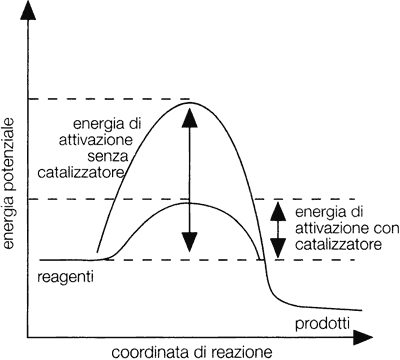 Diagramma esemplificativo dell'effetto esercitato da un catalizzatore sull'energia di attivazione nel corso di una reazione chimica.