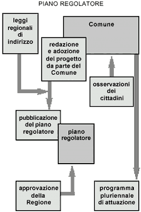 (p.r.g.). È lo strumento principale della pianificazione urbanistica a livello comunale. Sulla base dell'accertamento dello stato di fatto e delle previsioni di sviluppo del Comune nel periodo di validità del piano, esso prevede L 1150 17/8/1942 7 la destinazione d'uso delle aree, la possibilità di sfruttamento edificatorio, gli interventi realizzabili sul patrimonio edilizio esistente, le aree da destinare a servizi pubblici. Le norme di indirizzo per la formazione dei piani regolatori e le relative norme procedurali sono dettate dalle leggi regionali, dopo il trasferimento delle relative competenze dello Stato dpr 8 15/1/1972. Di norma il piano regolatore riguarda e disciplina il territorio di un Comune; è peraltro prevista la possibilità, in particolari condizioni, di redigere piani intercomunali o concernenti le Comunità montane.