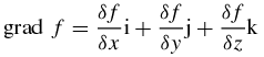 Il gradiente esprime la variazione di una grandezza fisica scalare per unità di lunghezza in una data direzione. Per esempio, si parla di gradiente termico per esprimere la variazione della temperatura lungo una direzione scelta, o di gradiente di pressione, analogamente, per esprimere la variazione della pressione lungo una particolare direzione. Si definisce gradiente di una funzione scalare f(x,y,z), il vettore, indicato con grad f, dato dalla somma delle tre derivate parziali prime della funzione lungo le tre direzioni, identificate attraverso i tre versori (che rappresentano i vettori di norma unitaria e di direzione e verso dei tre assi cartesiani x, y e z) indicati con le lettere i, j e k. In simboli: