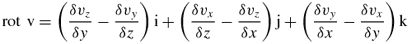 Il rotore, infine, è un operatore vettoriale che associa a un vettore un altro vettore le cui componenti sono date dalle differenze tra le derivate parziali delle componenti del vettore rispetto ai tre assi, combinate a due a due. Il rotore di un vettore v, di componenti v
