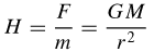 L'intensità del campo gravitazionale, H, è data dalla forza di attrazione gravitazionale esercitata da un corpo di massa M per unità di massa, ovvero dal rapporto tra la forza gravitazionale tra due corpi di massa M e m posti a distanza r, fratto la massa di prova m: